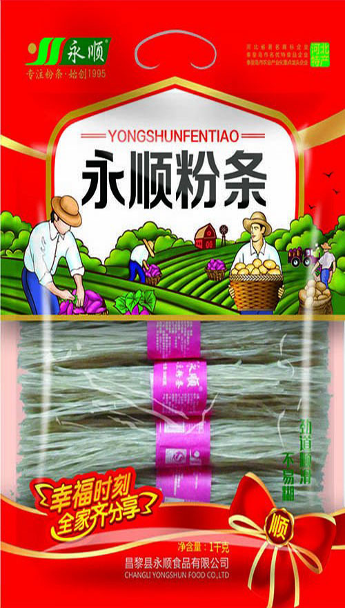 昌黎縣永順食品有限公司坐落于,河北省東北部的秦皇島市昌黎縣;昌黎北枕碣石,東臨渤海,西南挾灤河,全縣總面積1212平方公里,人口56萬,是久負盛名的花果之鄉、粉條之鄉、魚米之鄉、文化之鄉、旅游之鄉、養貉之鄉、干紅葡萄酒之鄉。昌黎永順食品于1995年建廠,開啟了在粉絲行業拼搏發展的新征程。從95年至今,歷經多次兼并重組,從當初的只有一個生產作坊發展到現在擁有永順等四個粉條生產加工區,12條生產線,本公司生產的粉條特點是:粗細均勻外觀光潔,色澤純正,晶瑩剔透。